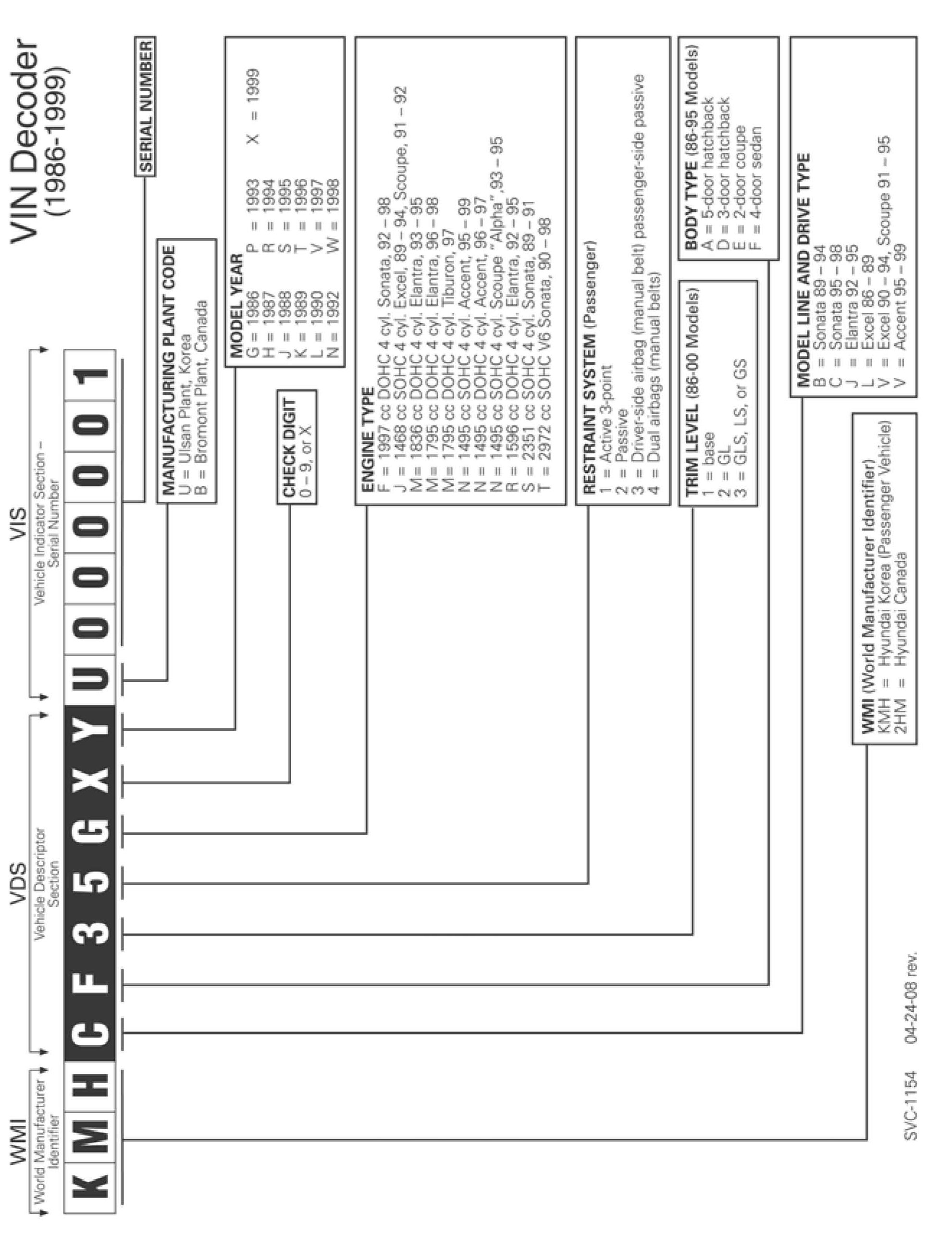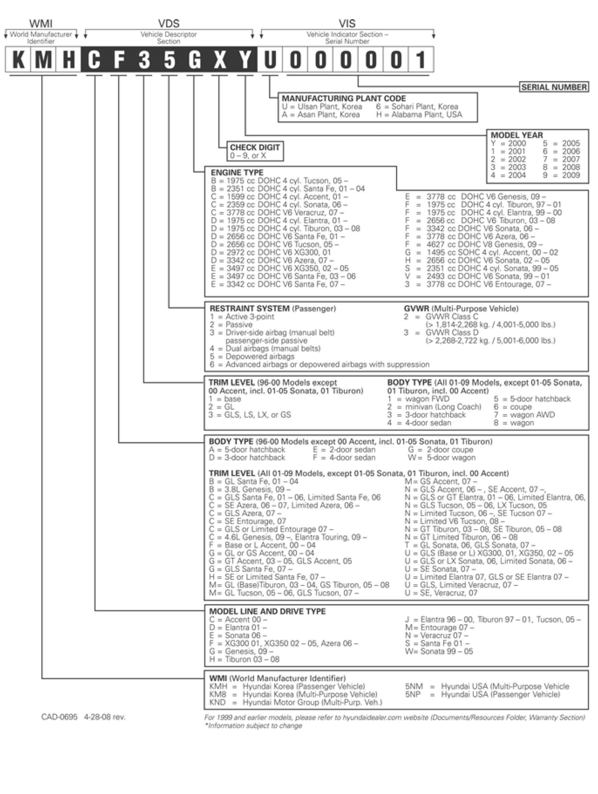 This bulletin provides information concerning the vehicle identification number (VIN) for all U.S. Specification Hyundai models. For vehicles in the 2000-2009 model year range, or for vehicles in the 1986-1999 model year range, refer to this TSB for definitions for each of the seventeen (17) characters in the VIN sequence.
