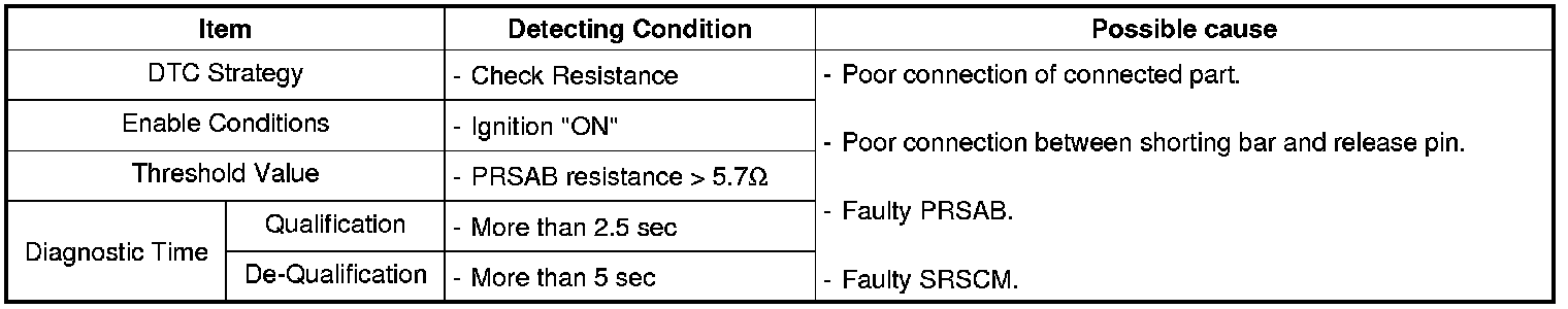The SRSCM sets DTC B1433 if the measured resistance value of PRSAB circuit is more than the threshold value.