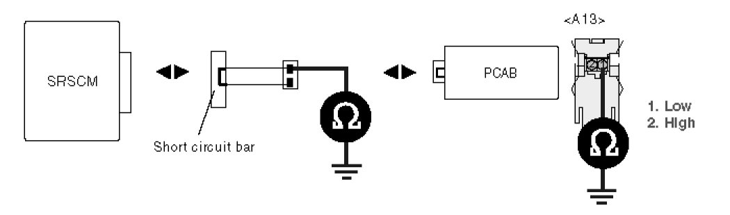 4. Measure resistance between terminal "1" or "2" of the PCAB harness connector and chassis ground.
