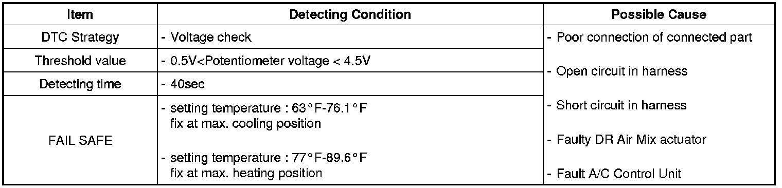 Temperature control actuator located at heater unit. It contains temp motor that changes temp door position and potentiometer that monitors position of temp door. Temperature control actuator regulates the temperature by the procedure as follows. Signal from control unit adjusts position of temp door by operating temp motor and then temperature will be regulated by the hot/cold air ratio decided by position of temp door. In operation, potentiometer delivers temp door position transformed into voltage value to A/C ECU.