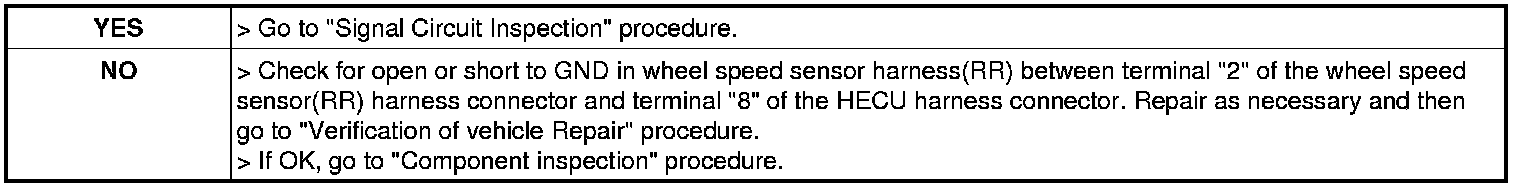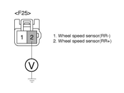 2. Measure voltage between terminal "2" of the wheel speed sensor (RR) harness connector and chassis ground.