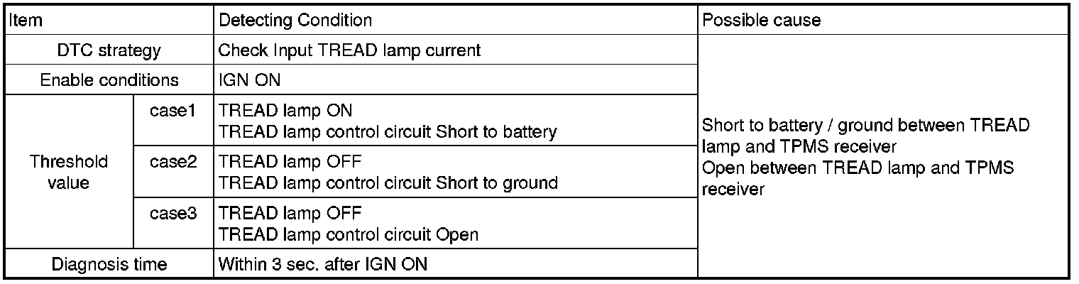 This DTC indicates that the Tread lamp control circuit short to battery when lamp is on.