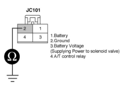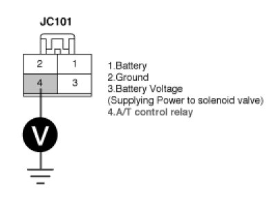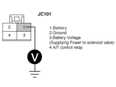 3. Measure the voltage between terminal "1" of the "A/T CONTROL RELAY" harness (JC101) connector and chassis ground.
