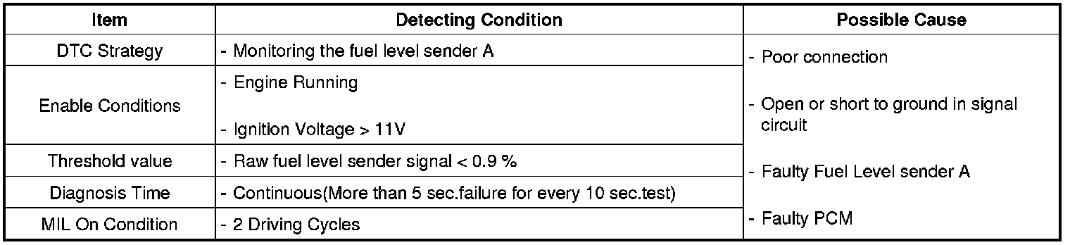 Checking output signals of fuel level sender A under detecting condition, if the fuel level is too low, PCM sets P2067. MIL (Malfunction Indication Lamp) turns on when the malfunction lasts till con secutive 2 driving cycle.
