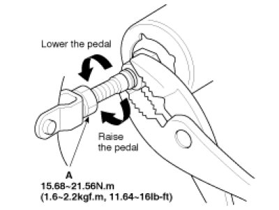 3. Loosen the pushrod locknut (A), and screw the pushrod in or out with pliers until the standard pedal height from the floor is reached. After adjustment, tighten the locknut firmly. Do not adjust the pedal height with the pushrod depressed.