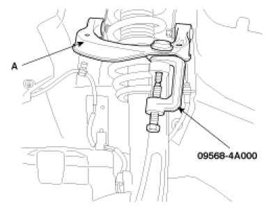 10. Using the special tool (09568-4A000), disconnect the knuckle from the upper arm assembly (A).