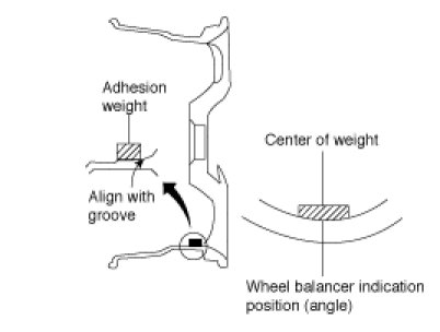 1) When installing balance weight to wheels, set it into the grooved area on the inner wall of the wheel as shown so that the balance weight center is aligned with the wheel balancer indication position (angle).