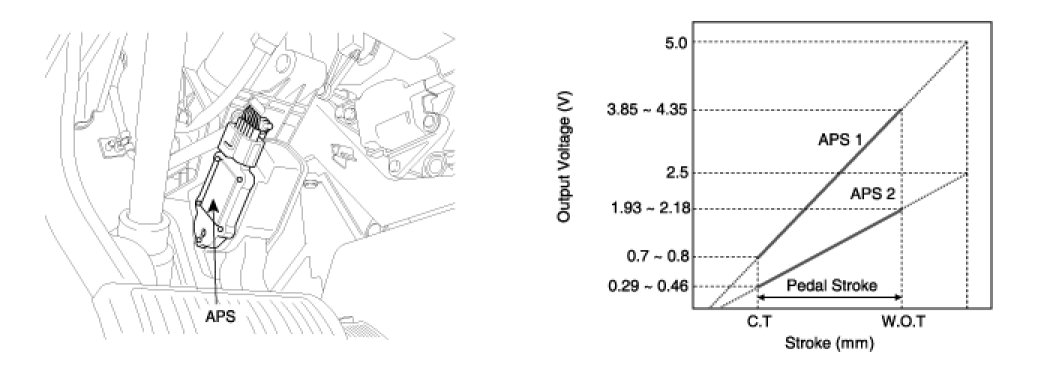 Accelerator Position Sensor (APS) is installed on the accelerator pedal module and detects the rotation angle of the accelerator pedal. The APS is one of the most important sensors in engine control system, so it consists of the two sensors which adapt individual sensor power and ground line. The second sensor monitors the first sensor and its output voltage is half of the first one. If the ratio of the sensor 1 and 2 is out of the range (approximately 1/2), the diagnostic system judges that it is abnormal.