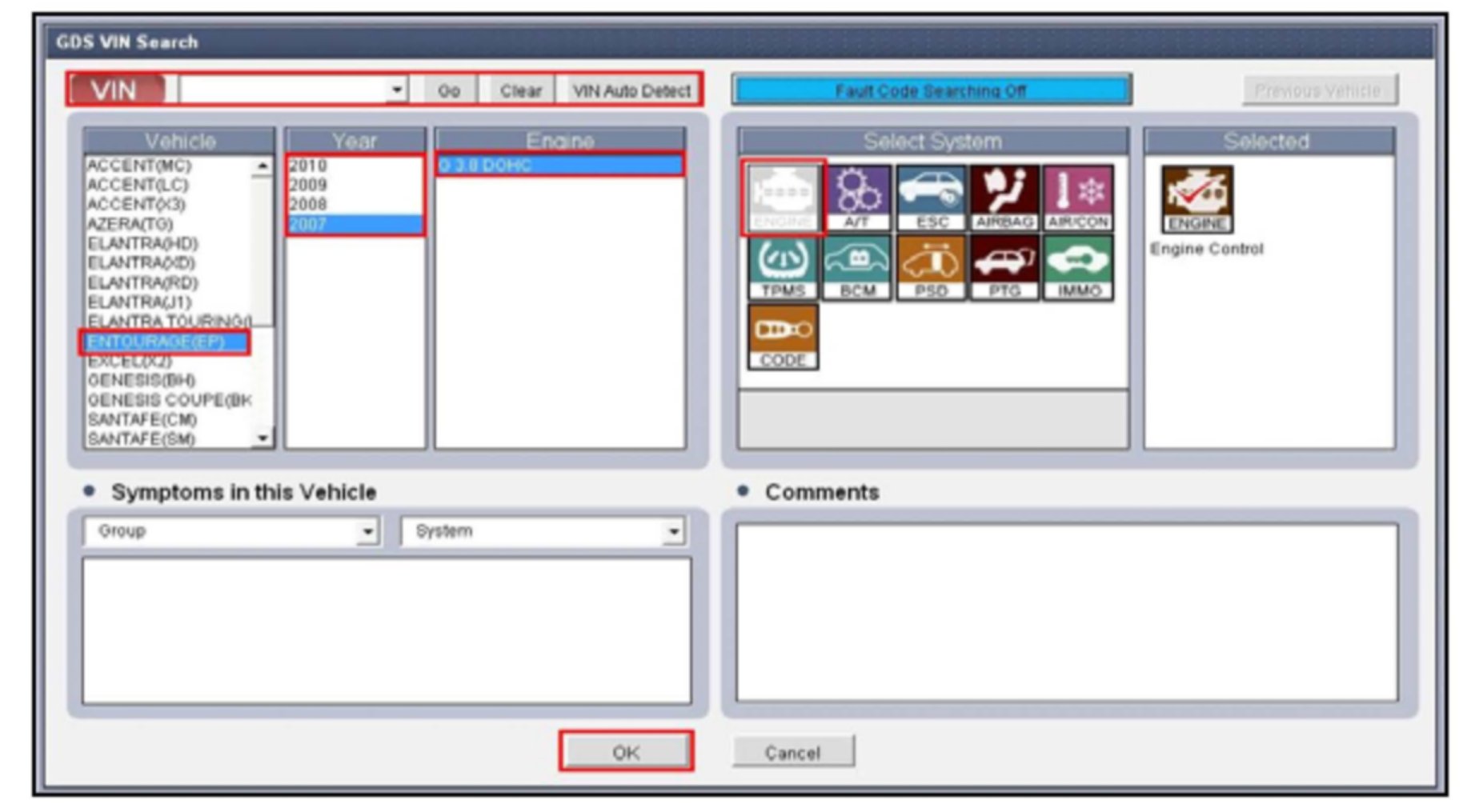 2. Enter the vehicle information by pressing the VIN Auto Detect button, entering the vehicle's VIN or selecting the vehicle model, model year, engine/fuel type and ENGINE as the system and then click OK.