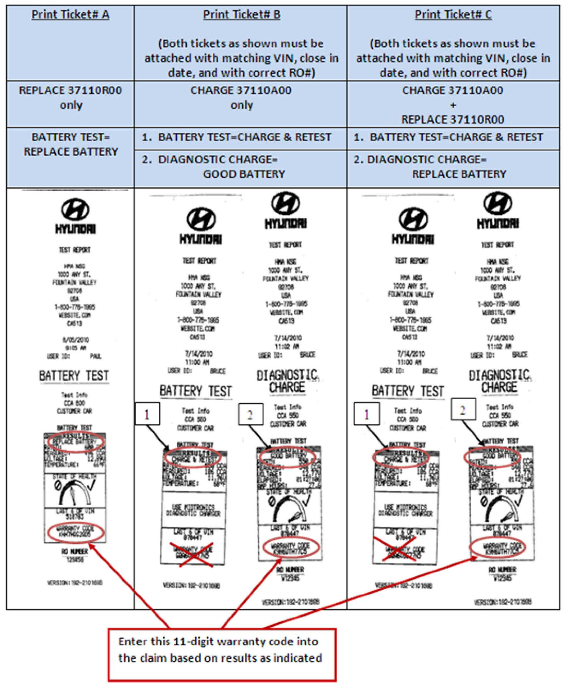 Print Tickets that must be attached to the Repair Order based on Battery Test result and Diagnostic Charge result are shown below, also listed are the warranty claim types: