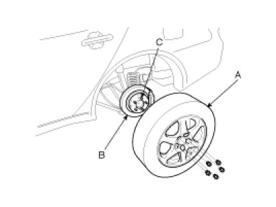 Be careful not to damage the hub bolts(C) when removing the rear wheel and tire(A).