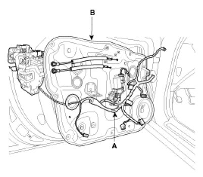3. Disconnect the door module wiring harness (A), then remove the module assembly (B).