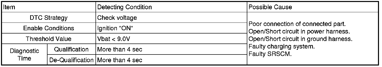 SRSCM (Supplemental Restraints System Control Module) checks input voltage when "IG ON" to make air bag system work properly.