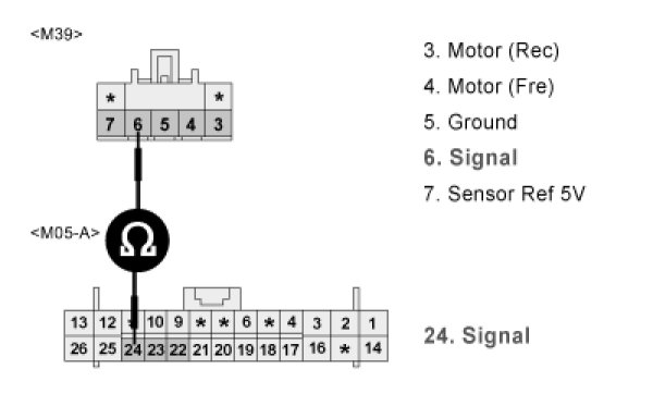 3. Measure resistance between terminal "6" of Intake actuator and terminal "24" of A/C control unit.