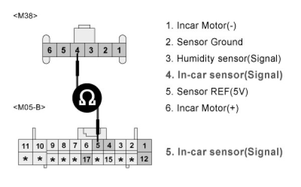3. Measure resistance between terminal "4" of incar temp.sensor and terminal "5" of A/C Control Unit