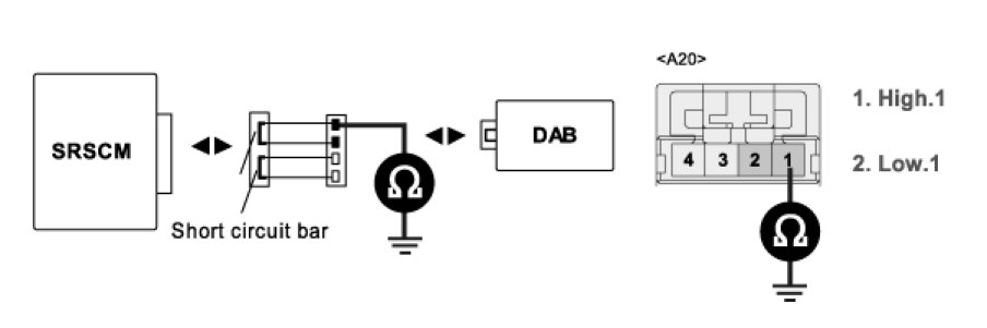 4. Measure resistance between terminal "1" or "2" of the DAB harness connector and chassis ground.