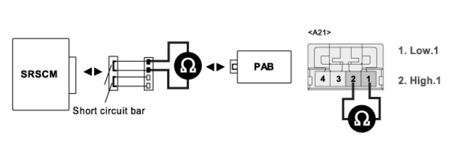 4. Measure resistance between terminal "1" and "2" of the PAB harness connector.