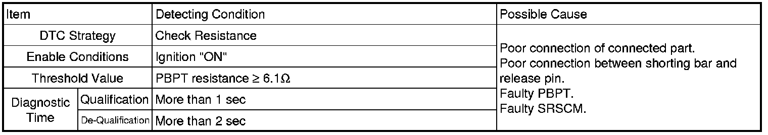 The SRSCM sets DTC B1367 if the measured resistance value of PBPT circuit is more than the threshold value.