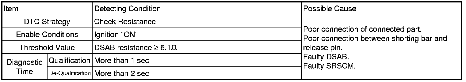 The SRSCM sets DTC B1378 if the measured resistance value of DSAB circuit is more than the threshold value.