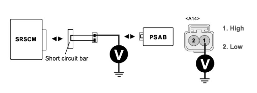 5. Measure voltage between terminal "1" or "2" of the PSAB harness connector and chassis ground.