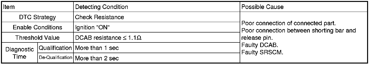 The SRSCM sets DTC B1474 if the measured resistance value of DCAB circuit is less than the threshold value.