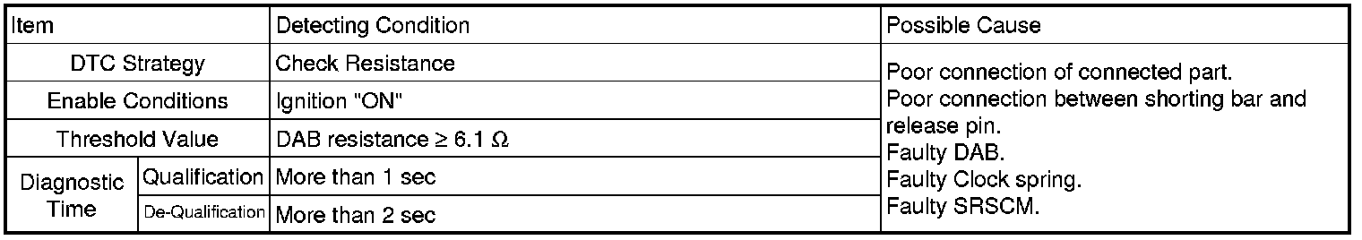 The SRSCM sets DTC B1481 if the measured resistance value of DAB circuit is more than the threshold value.