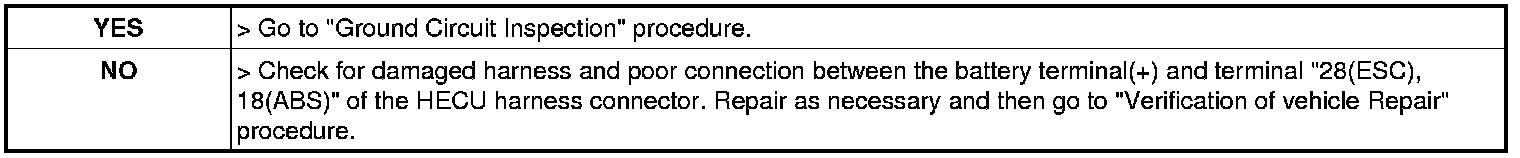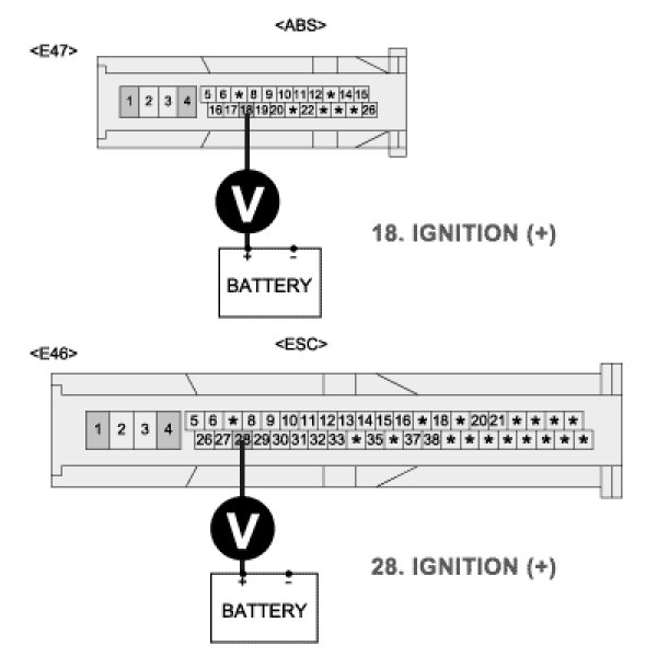 2. Measure voltage between the battery terminal (+) and terminal "28 (ESC), 18 (ABS)" of the HECU harness connector.