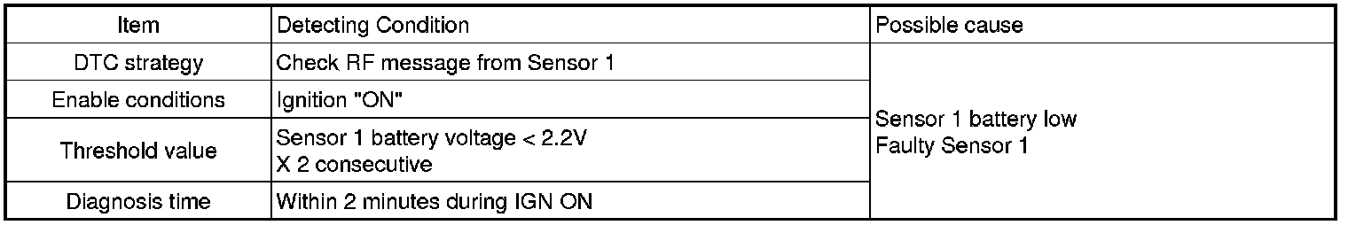 This DTC indicates that the Sensor 1 battery voltage is below 2.2 Vdc. The most likely cause is battery passing it's expected life / sensor failure.