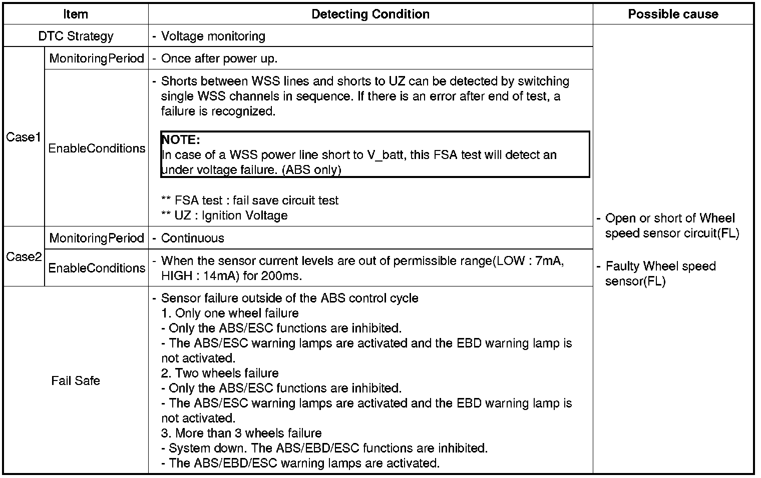 If the WSS circuit is broken, in that case a fault is detected by detecting abnormal input current. HECU cuts off the voltage supply to wheel sensor channel which had a fault and prevent vehicle's damage due to super heated harness.