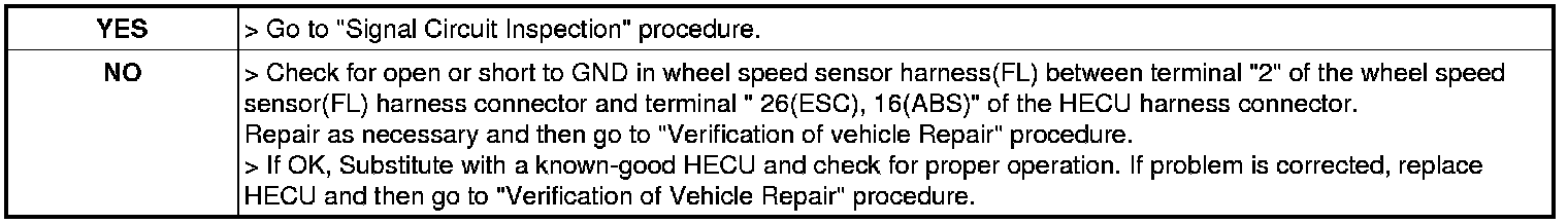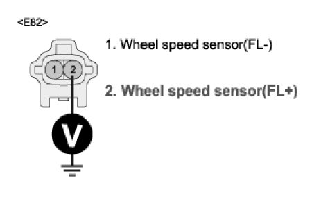 2. Measure voltage between terminal "2" of the wheel speed sensor (FL) harness connector and chassis ground.