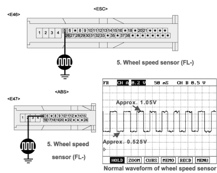 4. Measure wave between terminal "5" of the HECU harness connector and chassis ground.