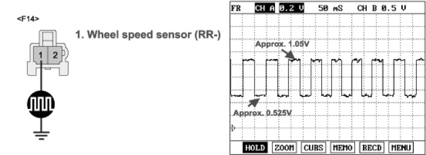 4. Measure waveform between terminal "1" of the wheel speed sensor harness connector and chassis ground.