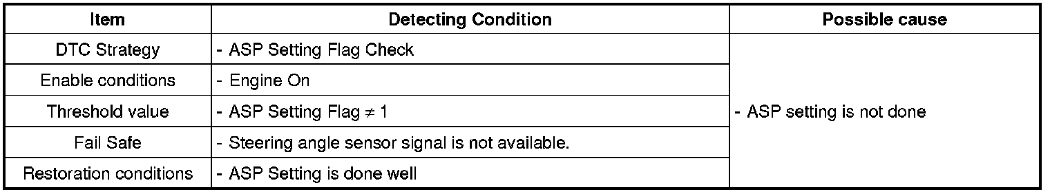 EPS CM sets this code if ASP (Absolute Steering Position) zero setting is not done when EPS CM losses steering angle signal due to EPS alignment replace etc. EPS CM stops "damper" and "return" control due to loss of steering angle signal.