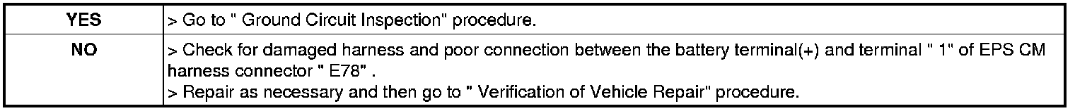 4. Measure voltage between terminal "1" of EPS CM harness connector "E78" and chassis ground while maintaining ENG. RPM 2,500 RPM over 2 minutes.