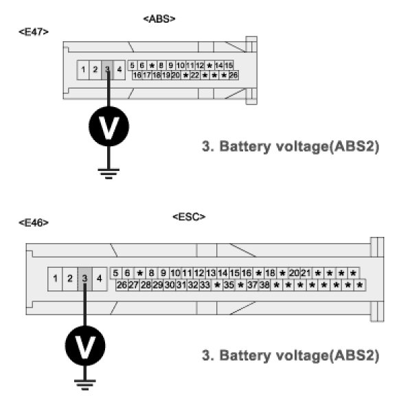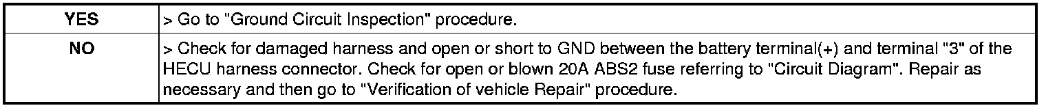 4. Measure voltage between terminal "3" of the HECU harness connector and chassis ground.