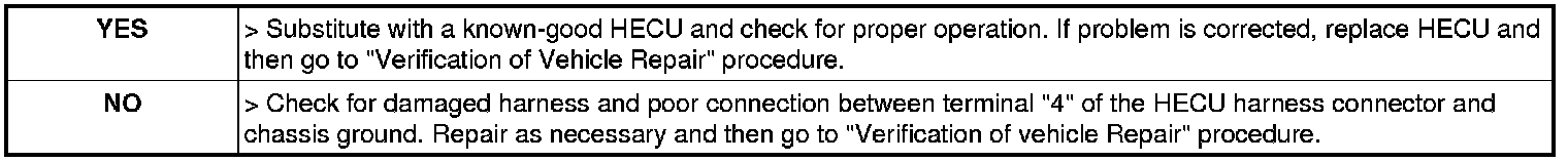 3. Measure resistance between terminal "4" of the HECU harness connector and chassis ground.