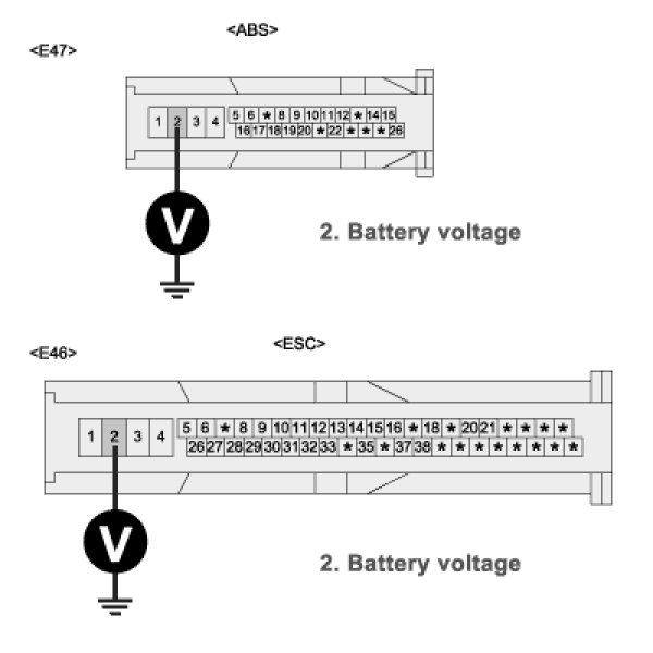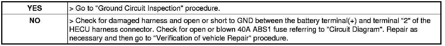 4. Measure voltage between terminal "2" of the HECU harness connector and chassis ground.