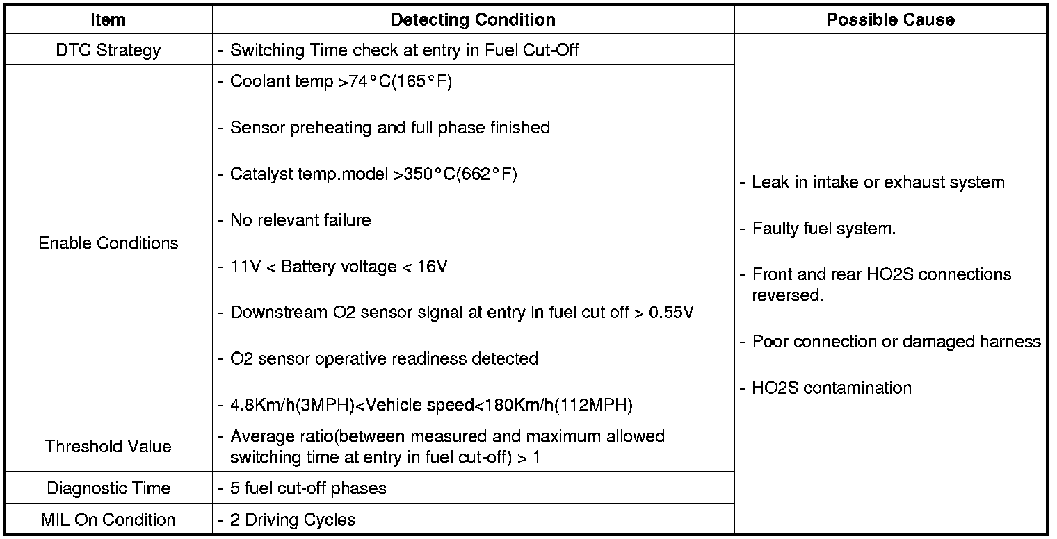 The ECM monitors rich-lean switching time of rear heated oxygen sensor (HO2S) after fuel cut-off to validate dynamic behavior of rear heated oxygen sensor (HO2S). After detection of fuel cut-off engine operating state, the ECM measures rich-lean switching time of the rear heated oxygen sensor (HO2S) signal and compares it to the predetermined limit value. DTC P0139 is set when the switching time is bigger than the limit value.
