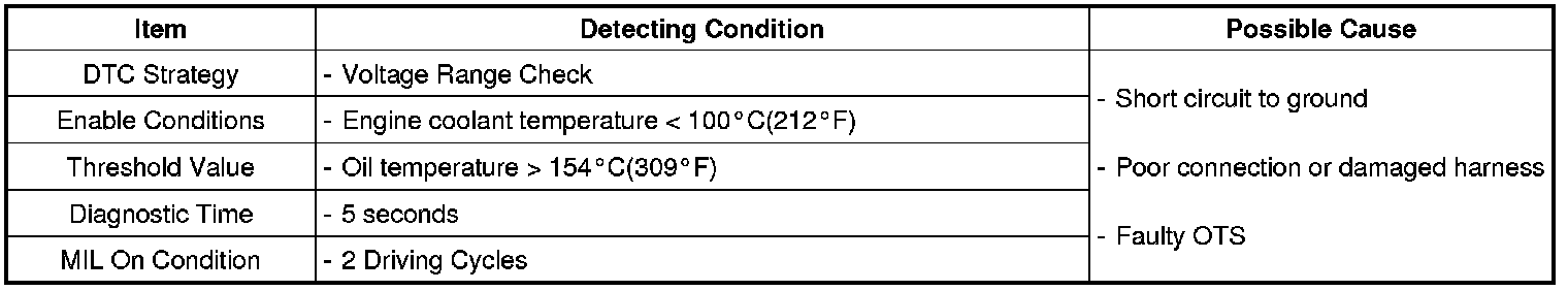 ECM sets DTC P0197 if the ECM detects signal voltage lower than the possible range of a properly operating OTS.