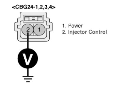 1. Measure voltage between terminal 2 of the injector harness connector and chassis ground