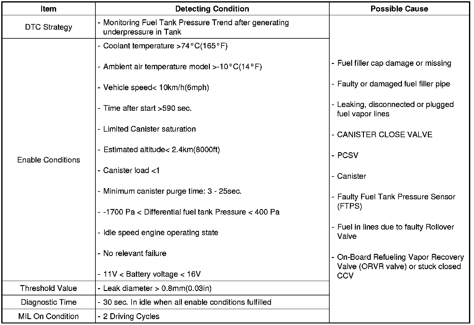 The PCM closes the Canister Close Valve (CCV) at the charcoal canister to seal off the evaporative emission system and then opens purge control valve (PCSV) to generate a vacuum in the fuel tank. After vacuum generation, the PCM measures pressure differential curve in the fuel tank and sets DTC P0442 or P0456 if the vacuum generated within a monitoring period increases above a defined threshold. If same error code is set in the next driving cycle, the PCM illuminates the MIL.