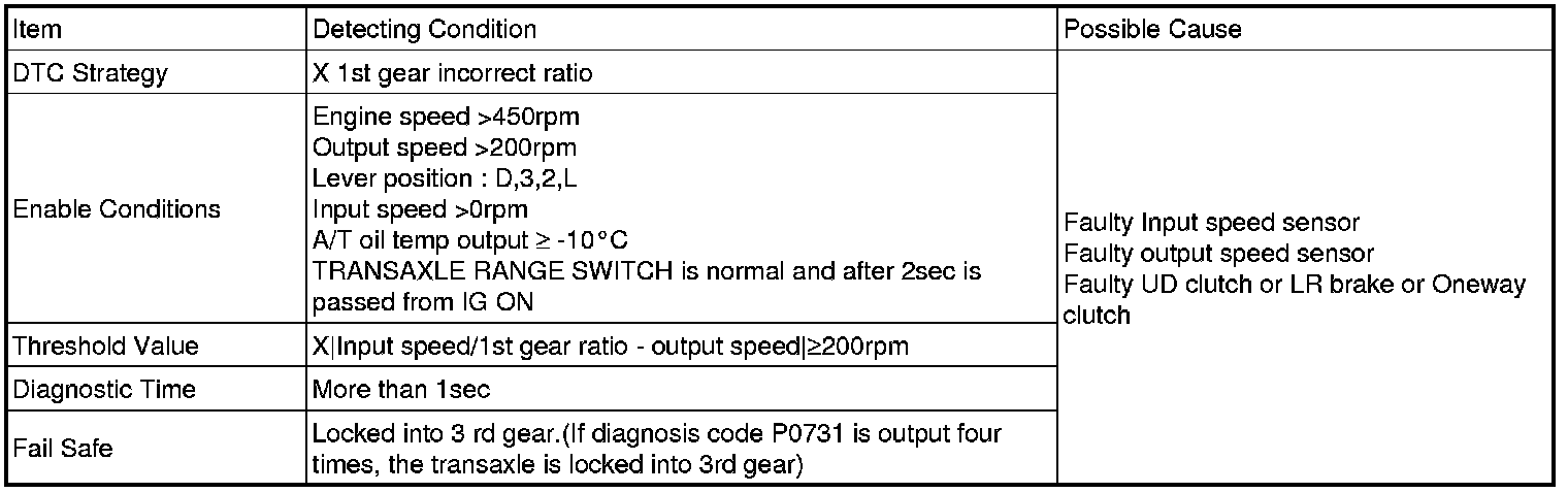 This code is set if the value of input shaft speed is not equal to the value of the output shaft, when multiplied by the 1st gear ratio, while the transaxle is engaged in 1st gear. This malfunction is mainly caused by mechanical troubles such as control valve sticking or solenoid valve malfunctioning rather than an electrical issue.