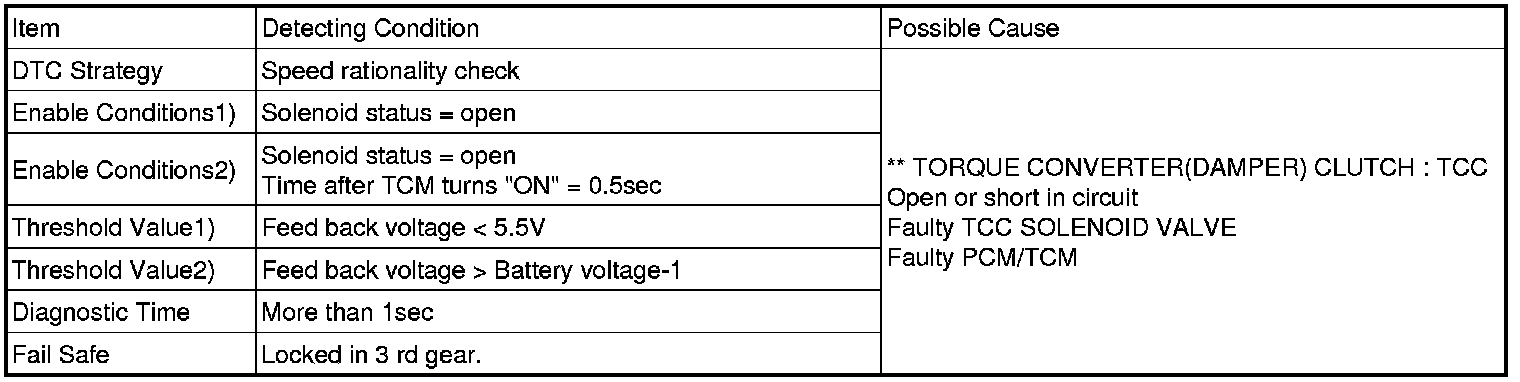 The PCM/TCM checks the Damper Clutch Control Signal by monitoring the feedback signal from the solenoid valve drive circuit. If an unexpected signal is monitored (for example, high voltage is detected when low voltage is expected, or low voltage is detected when high voltage is expected) the PCM/TCM judges that DCCSV circuit is malfunctioning and sets this code.