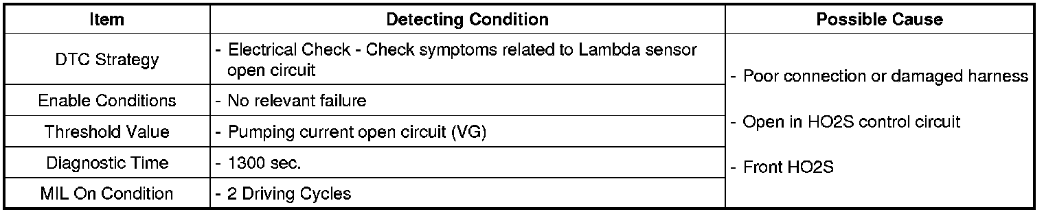 The ECM monitors front HO2S tip temperature and signal at the same time to check open circuit of Pumping Current Circuit. The PCM sets DTC P2237 if front O2 tip temperature is higher than the predetermined threshold and front HO2S signal stuck is detected. If the same error code is set in the next driving cycle, the ECM illuminates the MIL.