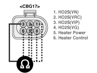 4. Measure resistance between terminals 3 and 1,2,4,5,6 of the HO2S harness connector