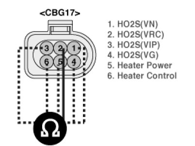 4. Measure resistance between terminals 2 and 1,3,4,5,6 of the HO2S harness connector.