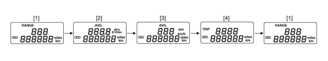 Distance to empty [1] -> Average fuel consumption [2] -> Average speed [3] -> TRIP [4] -> Distance to empty [1].