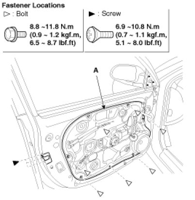 3. Loosen the door module mounting bolts, then remove the door module (A).