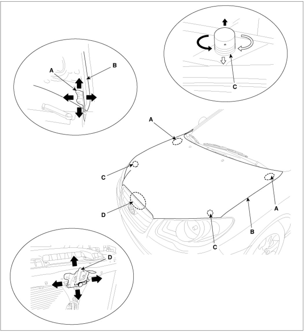 3. After loosening the hood latch (D) mounting bolts, adjust the latch by moving it up or down, or right or left.