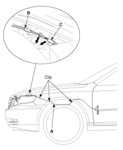 2. Disconnect the hood latch cable (B) and release cable (C).